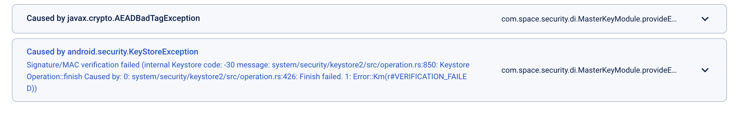 안드로이드에서는 개발을 할때 백업 기능이 기본적으로 활성화 되어 있었습니다. Android security를 통해 암호화를 진행하고 EncryptedSharedPreferences에 저장을 하고나서 복보화키는 Android KeyStore에 저장되는 구조였습니다. 그러나 여기서 문제가 발생합니다. 안드로이드에서 백업이 이루어질때 SharedPreferences도 백업이 이루어지지만, KeyStore에 저장된 복보화된 키는 백업이 되지 않기 때문에 나중에 앱사용할때 키는 없는데 데이터가 존재하니 KeyStoreException가 발생했습니다.